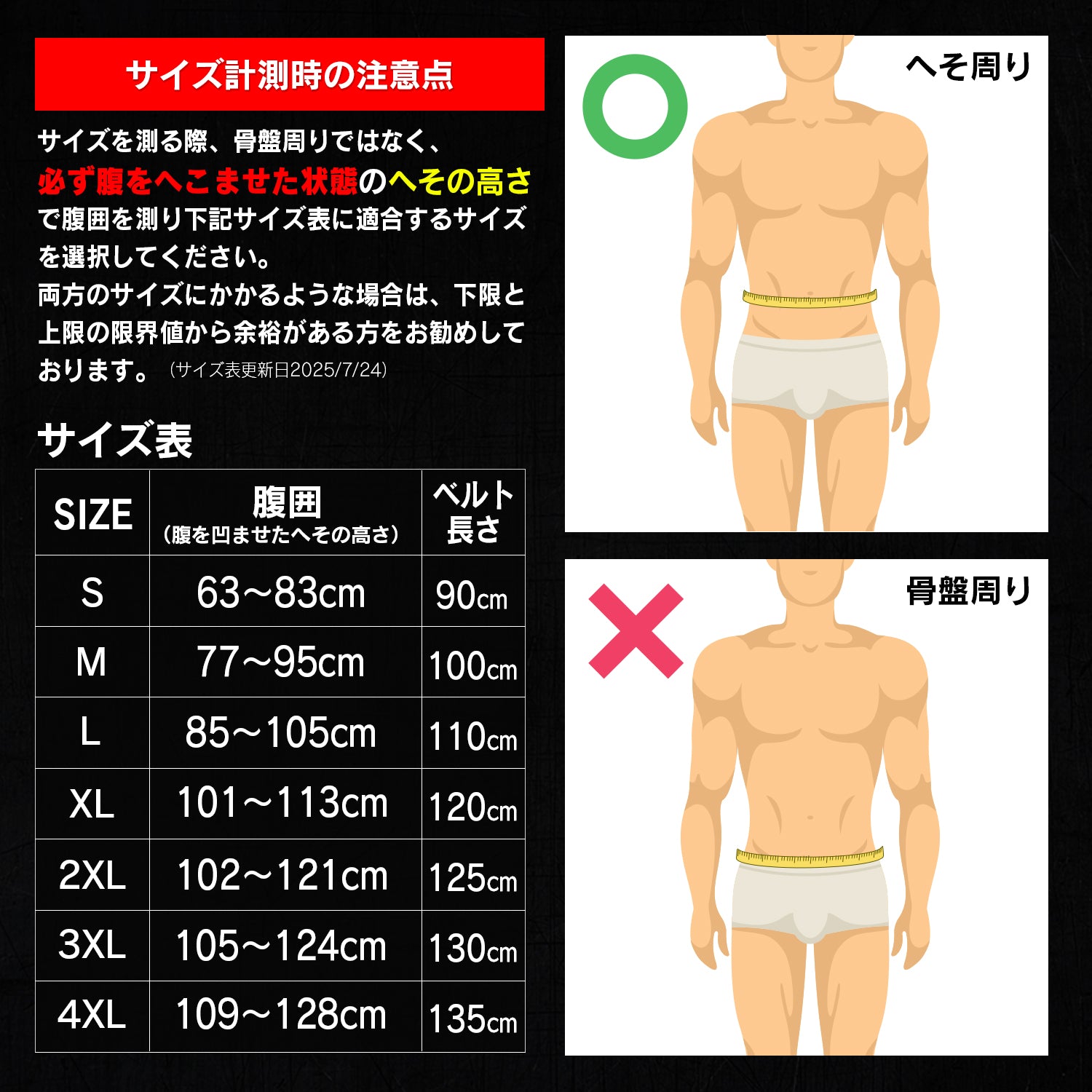 ※サイズの計測は必ずお腹をへこませた状態でへその位置の腹囲を測り、サイズ表に適合するものをお選びください。両方のサイズにかかるような場合は、下限と上限の限界値から余裕がある方をお勧めしております。
